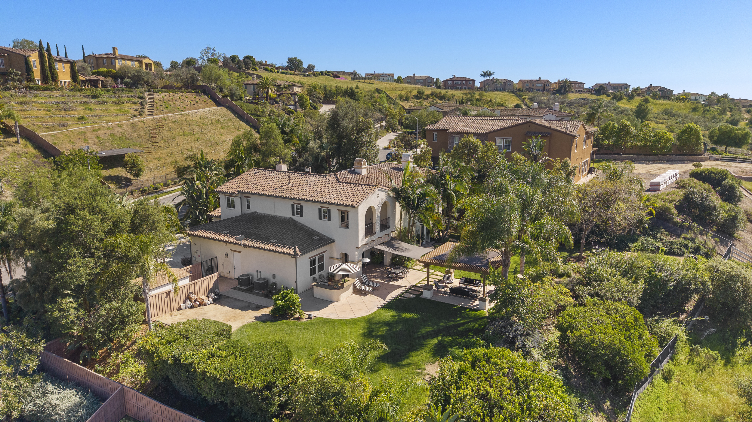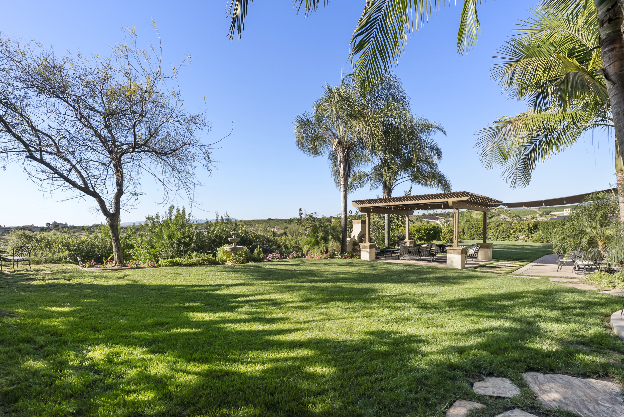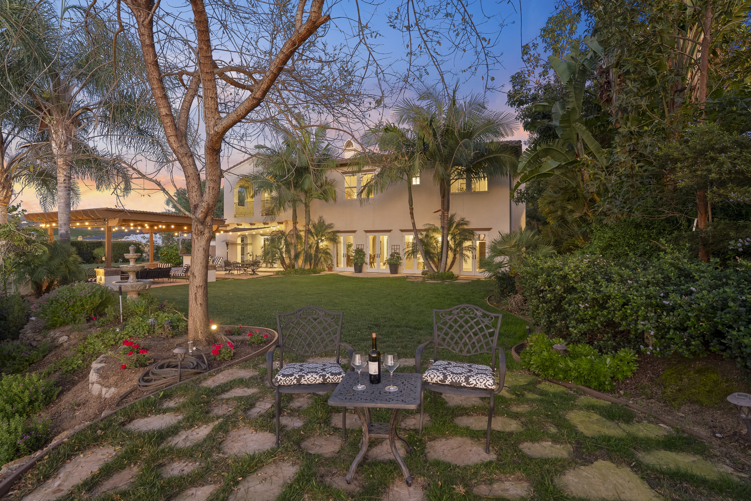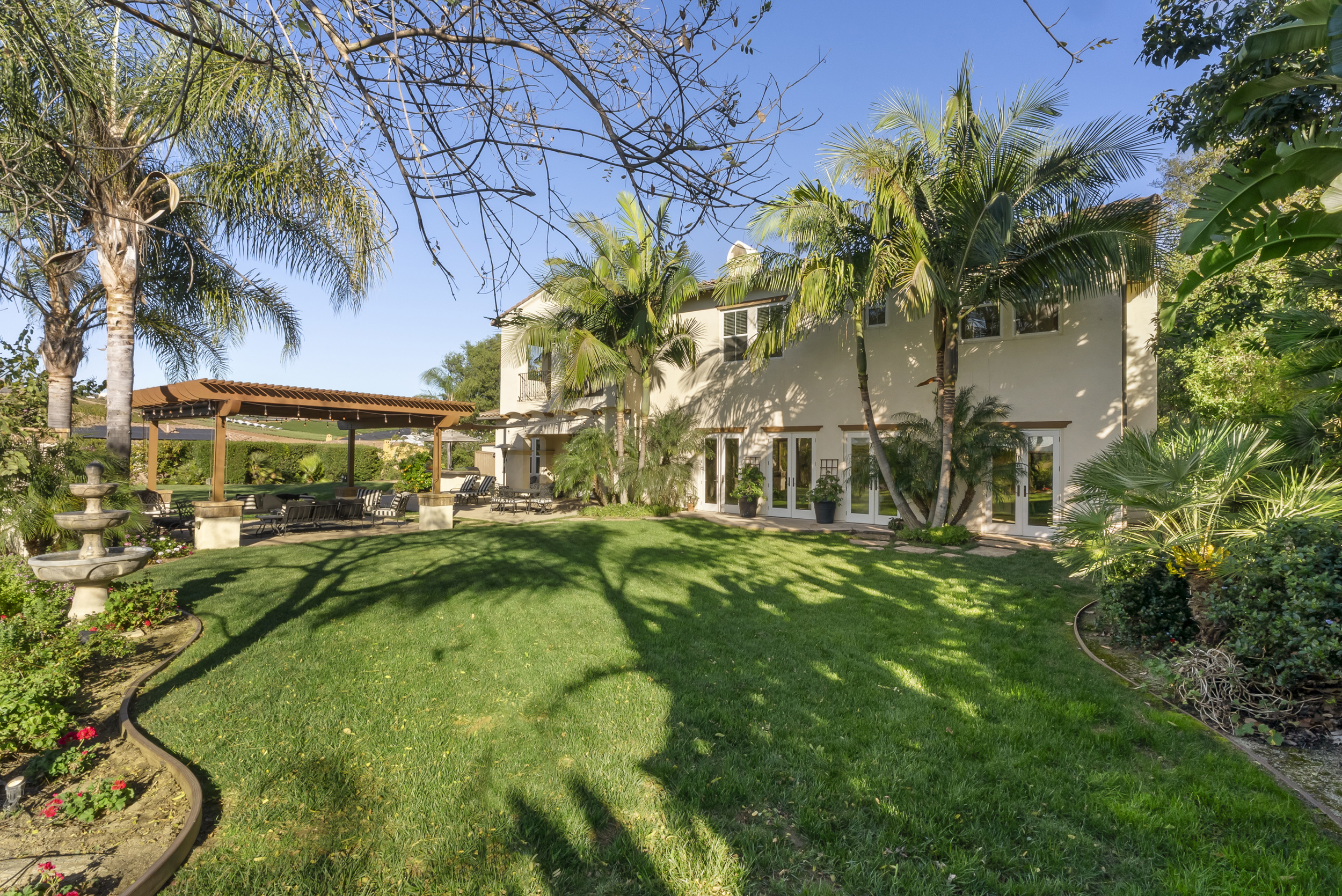 The backyard is designed for both everyday living and entertaining, featuring a pergola-covered patio, outdoor fireplace, built-in BBQ, and mature landscaping that frames the setting. A gated courtyard entry with fountain creates a strong sense of arrival.